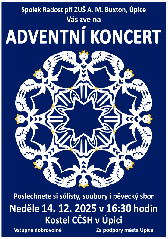 Srdečně vás zveme na ADVENTNÍ KONCERT, který se uskuteční v neděli                        14. prosince 2025 od 16:30 hodin v krásném prostředí úpického kostela CČSH.
