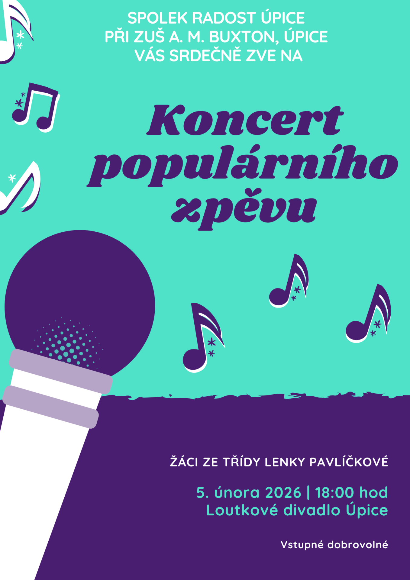 Zpěvačky a zpěváci ze třídy Lenky Pavlíčkové Vás srdečně zvou na KONCERT POPULÁRNÍHO ZPĚVU.