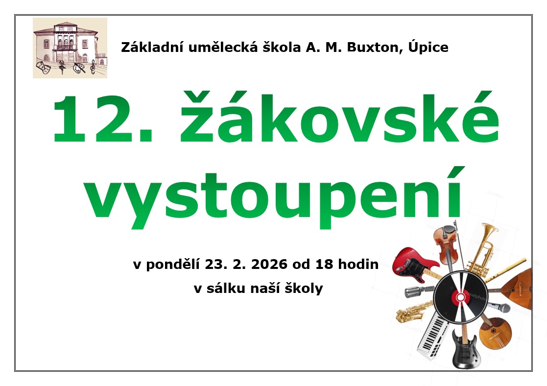 Srdečně Vás zveme na 12. žákovské vystoupení v úterý 19. 2. 2025 od 18:00 hodin.