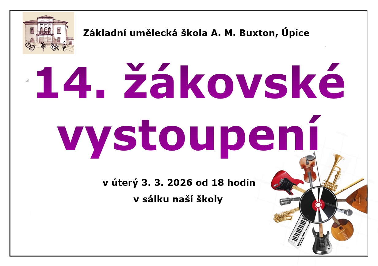 Srdečně Vás zveme na 14. žákovské vystoupení v úterý 26. 2. 2025 od 18:00 hodin.