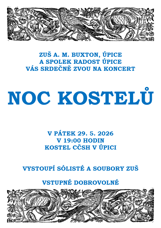Srdečně Vás zveme na koncert Naděje ve středu 18. 6. 2025 do kostela CČSH v Úpici od 19:00 hodin. Vystoupí sólisté a soubory ZUŠ A. M. Buxton, Úpice